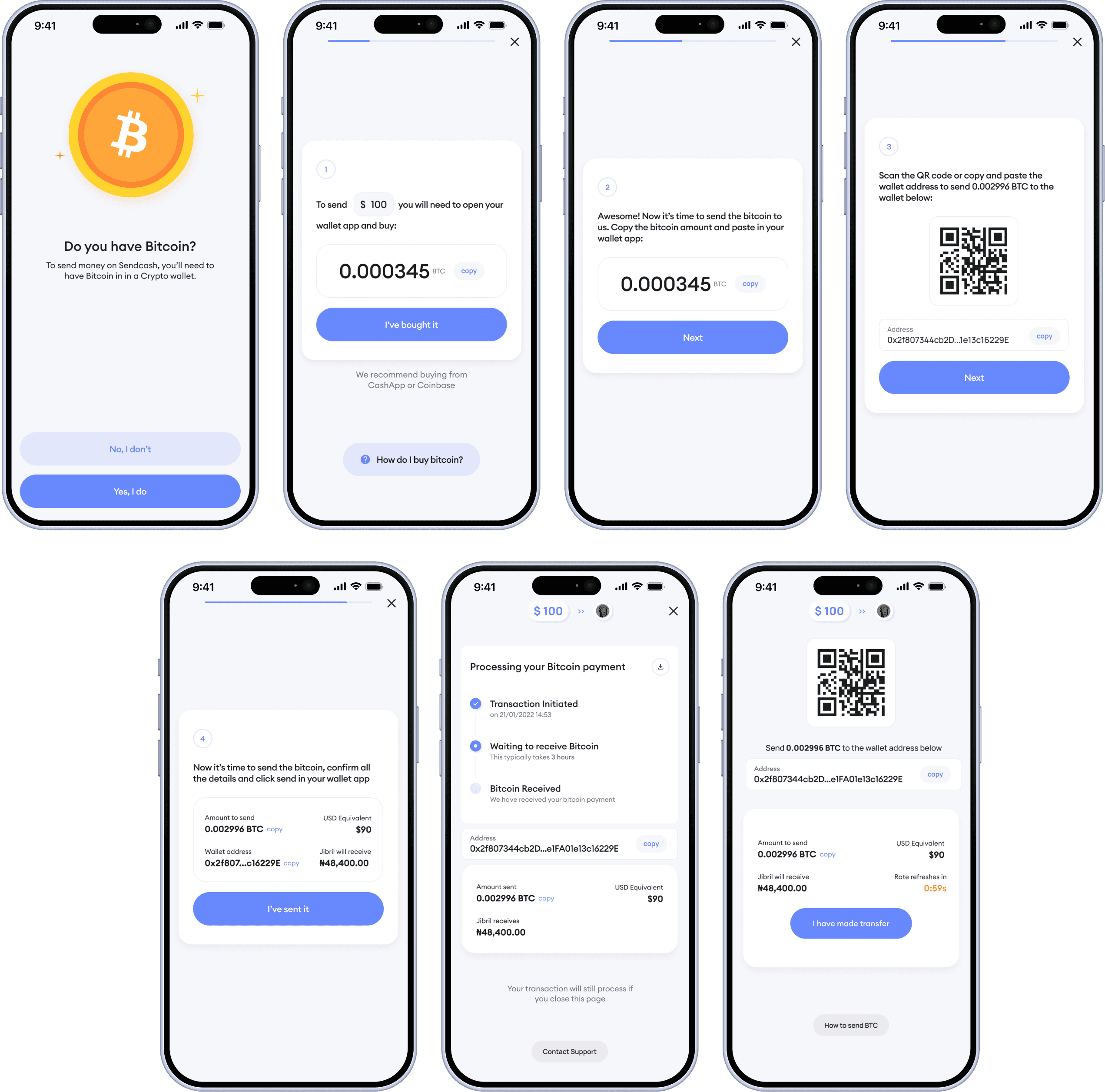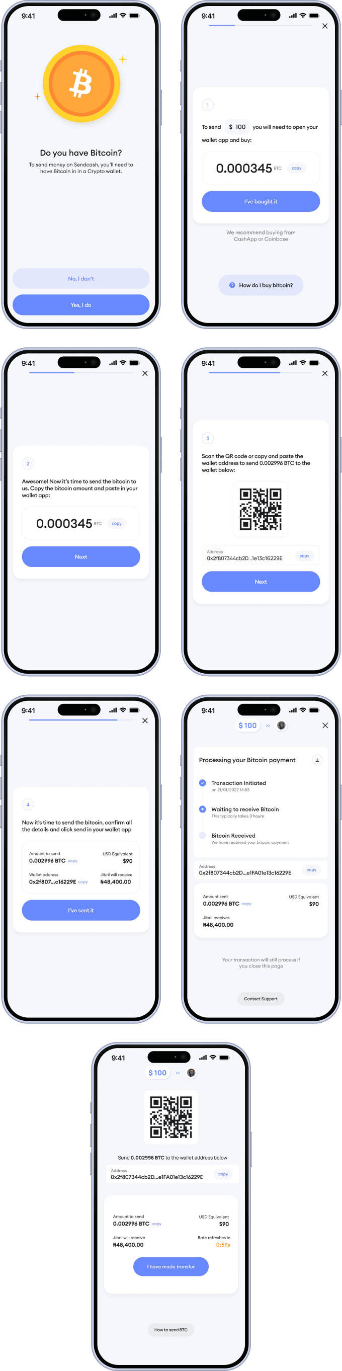 From buying Bitcoin to sending it to the recipient. The app asks users if they already have Bitcoin, and if they don't, it shows them exactly how much they need to buy and recommends trusted platforms, complete with video tutorials. Sending Bitcoin is streamlined, with easy copying of amounts and wallet addresses. I included a confirmation screen that clearly displays all the transaction details, so users can double-check everything before hitting send. After the transaction is initiated, the app keeps users in the loop with real-time updates on the transaction status, all while having the transaction details readily available for reference.