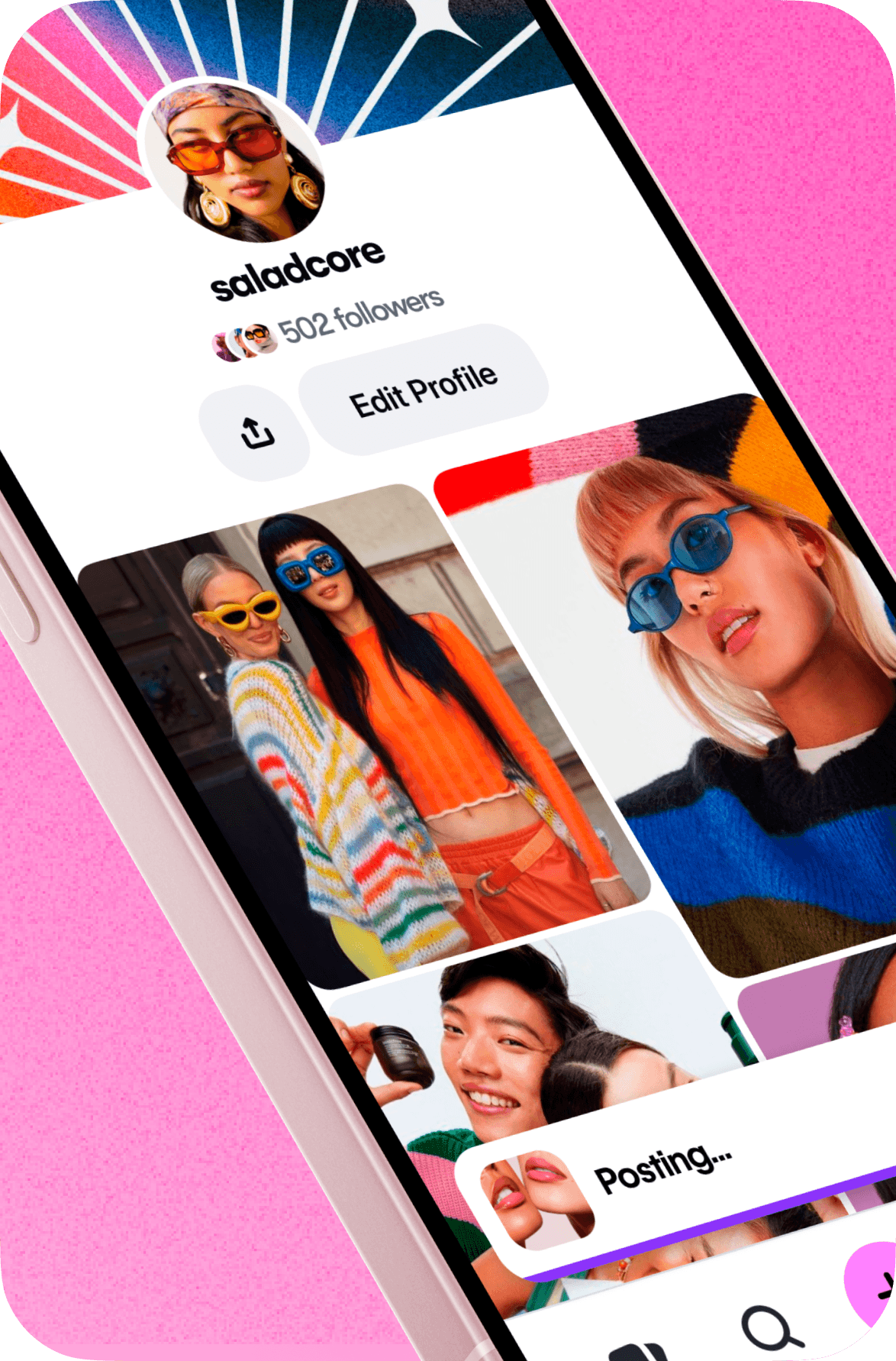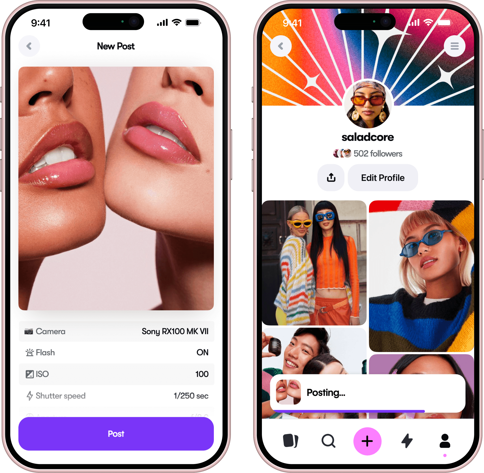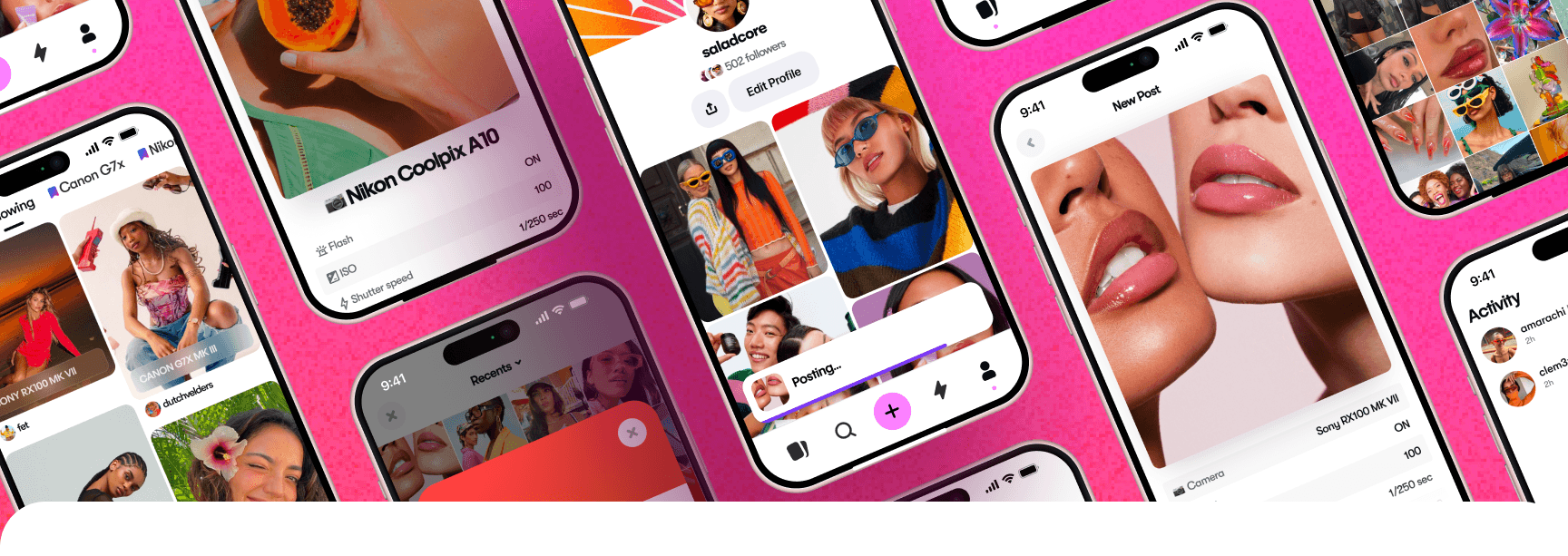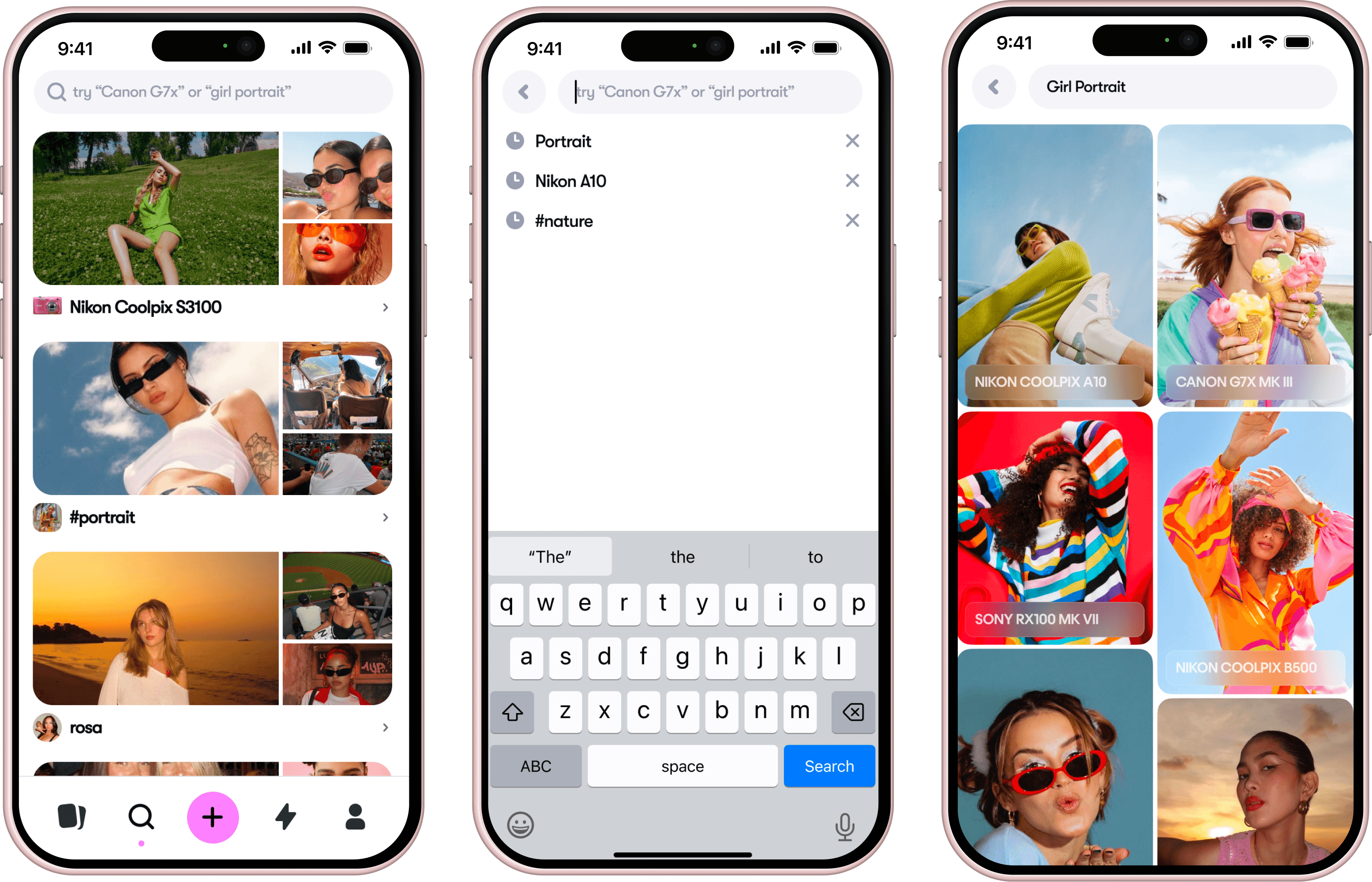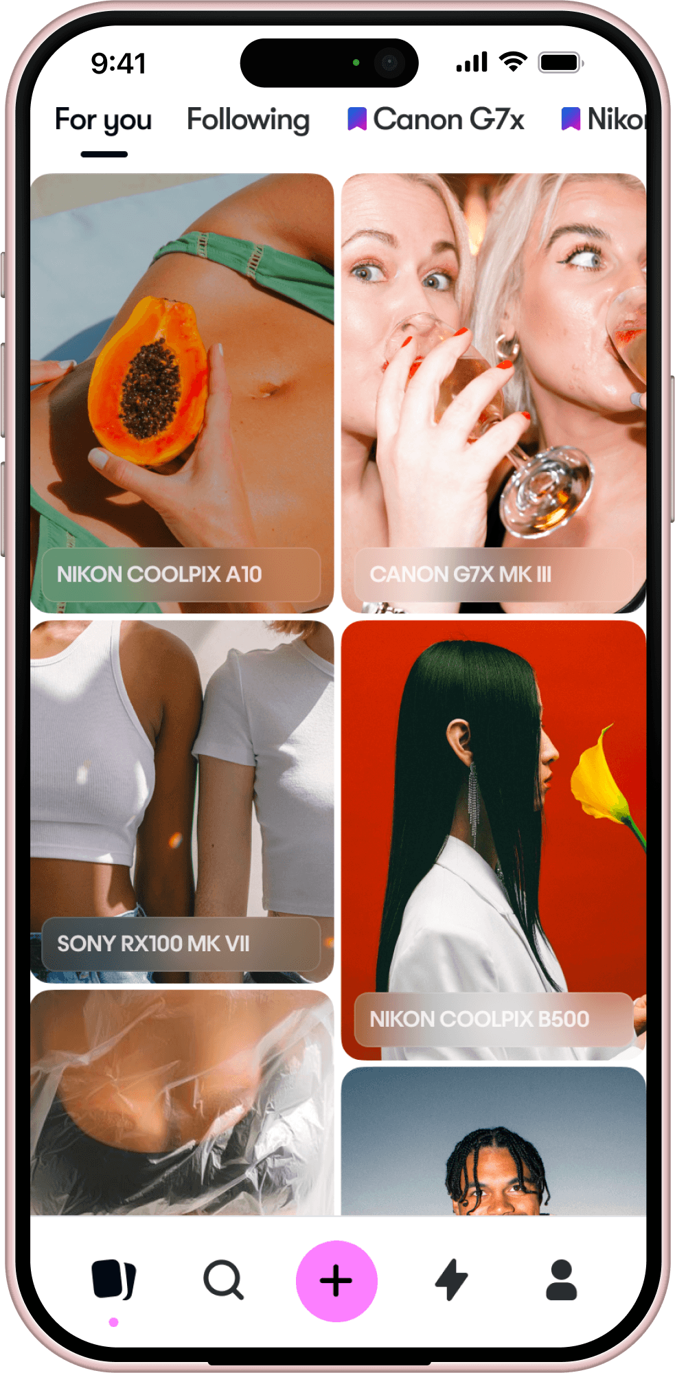 The home screen features a dynamic feed of images curated to match user interests, past interactions, and popular content, creating a personalized experience for every user. Each image is clearly tagged with the camera used right there on the feed which enhances the user experience by providing immediate important context for users.