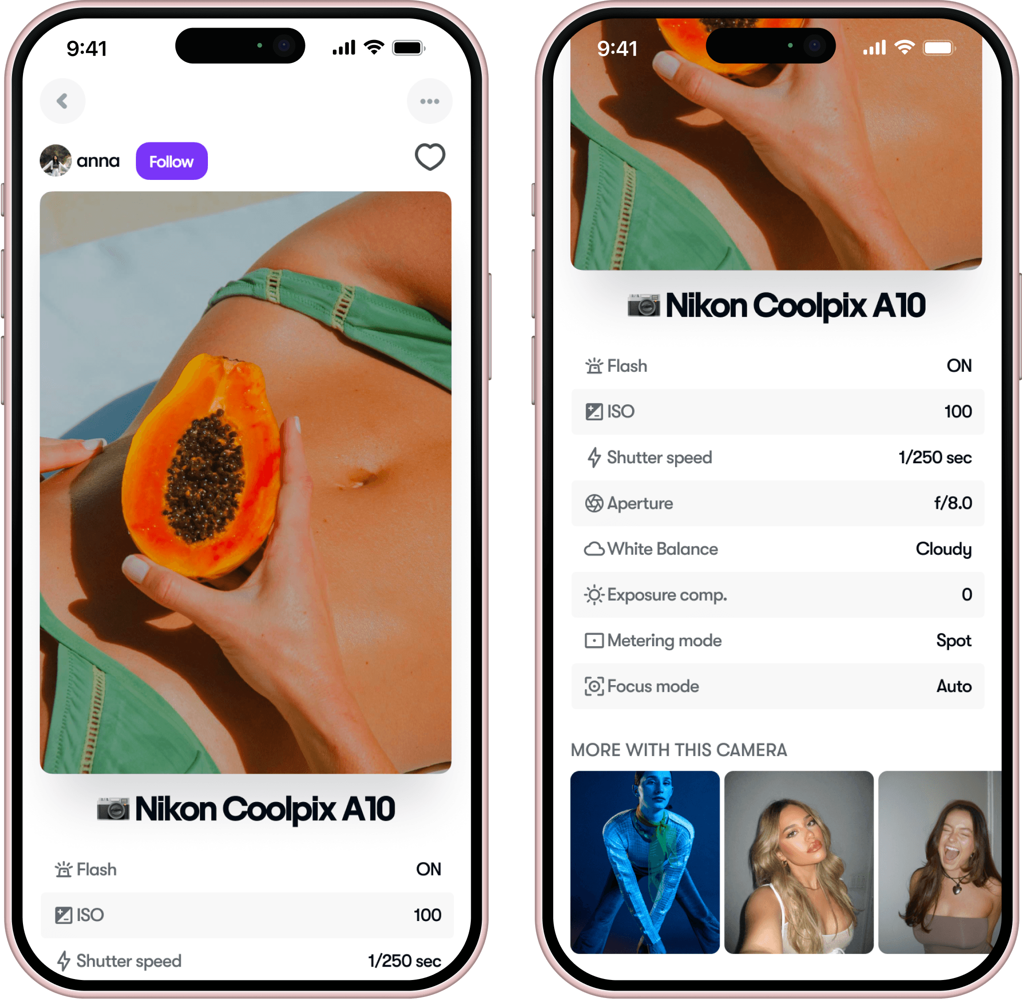 This screen provides comprehensive details about each photo. When users click to expand an image, they see detailed camera settings such as flash status, ISO, shutter speed. These settings are prominently displayed, allowing users to learn and replicate techniques.